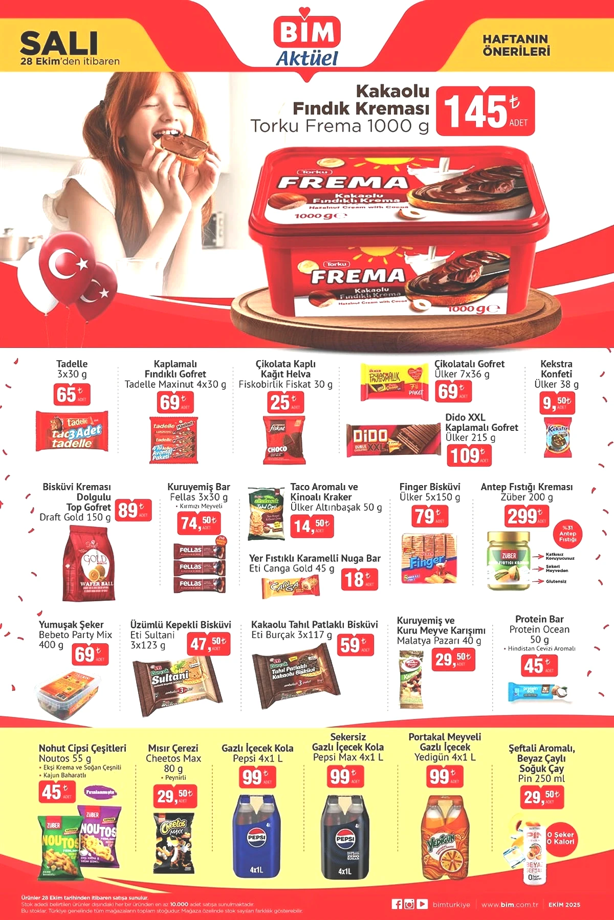 BİM, 28 Ekim Salı'dan itibaren geçerli indirimli aktüel kataloğunda hem gıda hem de kişisel bakım ürünlerinde cazip fırsatlar sunuyor. Torku Frema Kakaolu Fındık Kreması, Rextorex şampuan serisi, Molfix bebek bezleri ve temizlik ürünlerindeki fırsatları kaçırmayın!