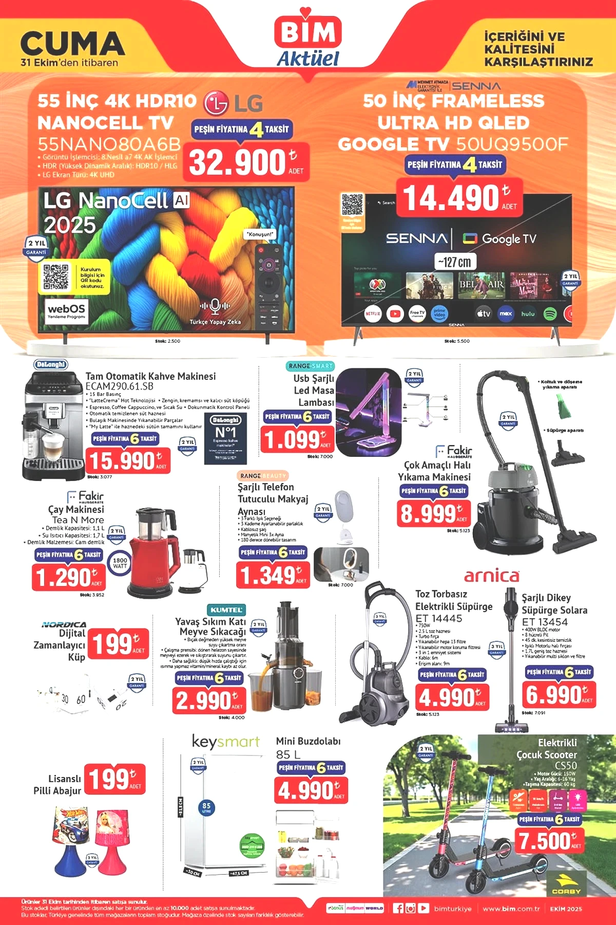 BİM’in 31 Ekim 2025 tarihli aktüel ürün kataloğu, her cebe uygun fırsatlarla dolup taşıyor. Elektronik ürünlerden ev gereçlerine, oyuncaklardan tekstil kategorisine kadar pek çok ürün, 6 taksit avantajı ve sınırlı stoğu ile sunulacak.